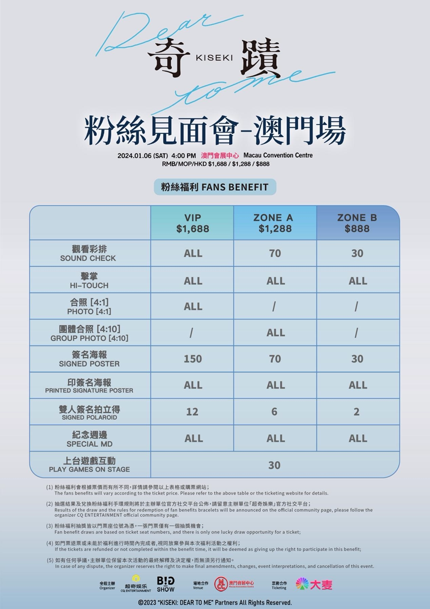 港币/澳门币票面价:MOP $1688 / MOP $1288/ MOP $888