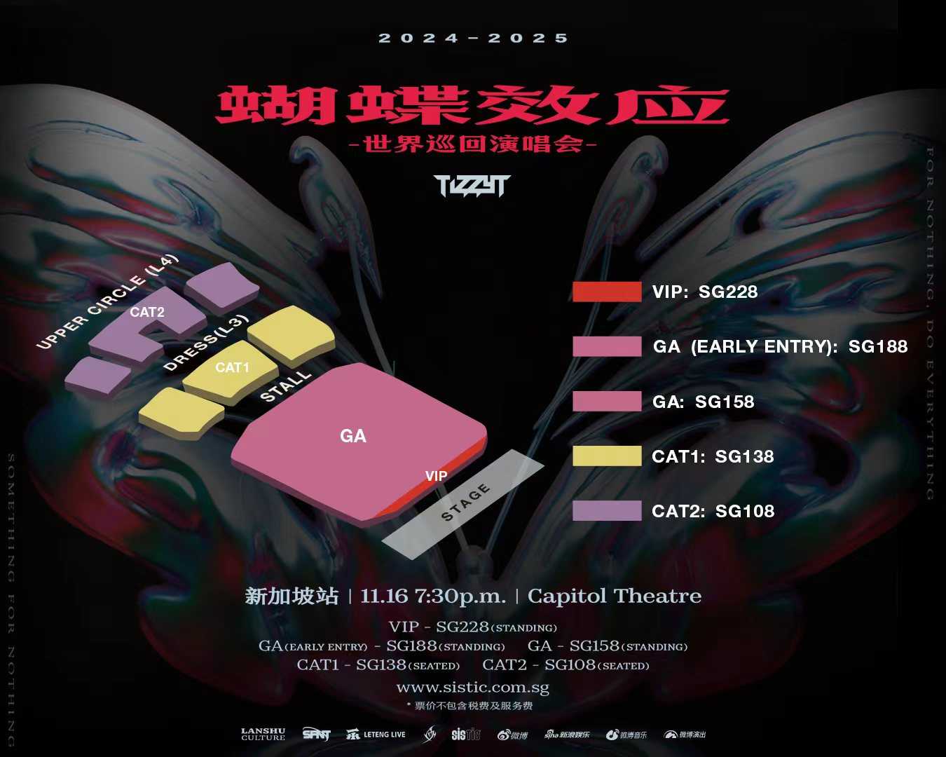 掀动翅膀,全新的旅程就要出发。此次TizzyT「蝴蝶效应」世界巡回演唱会将一路途径悉尼站、墨尔本站、纽约站、多伦多站、波士顿站、洛杉矶站、温哥华站、新加坡站、吉隆坡站、香港站等站次,在时间轴的又一个全新篇章,我们不见不散!